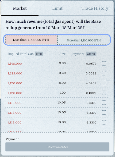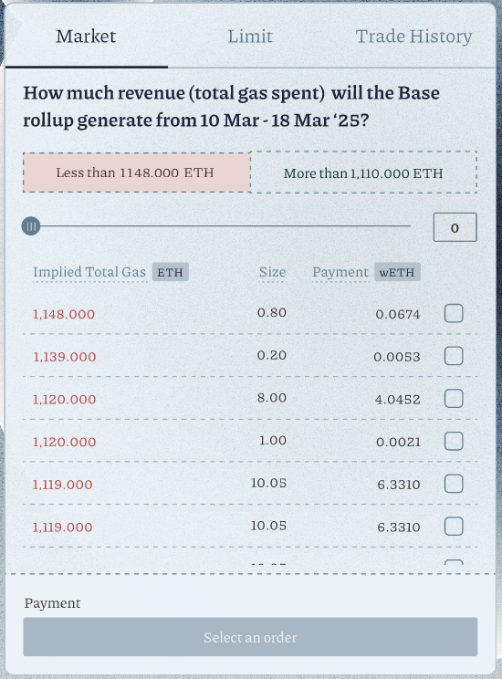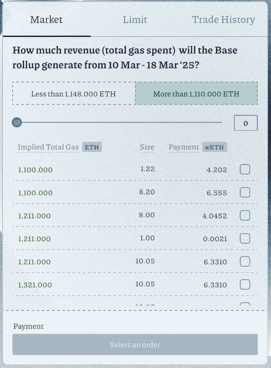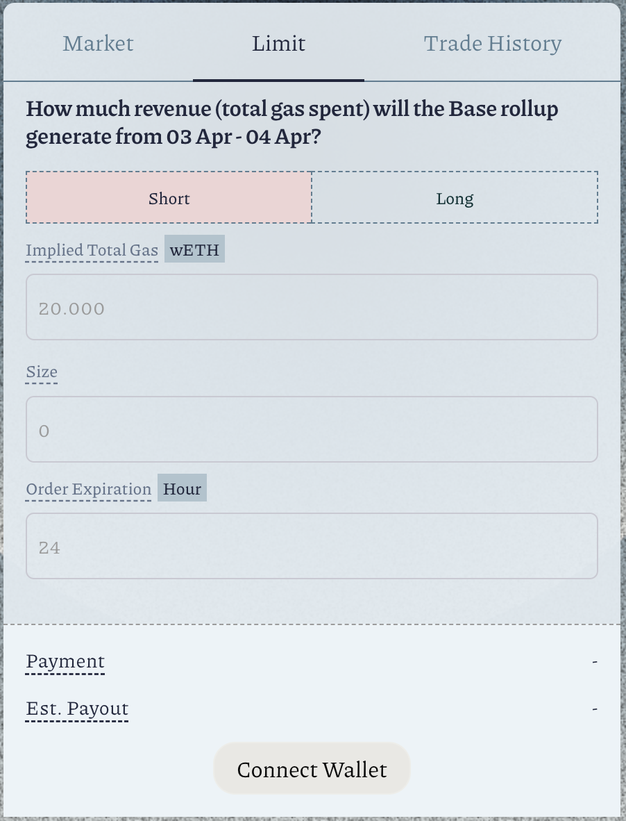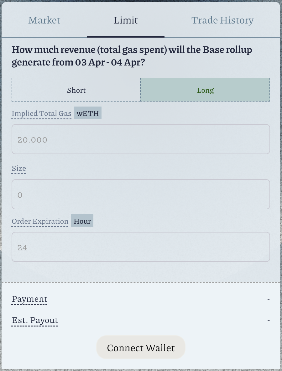 Based on your research of onchain events, input a value inImplied Total Gas. For example, the currentTotal Base Revenueis 200 ETH. You have determined that the finalTotal Base Revenuewill increase and land at 500 ETH. The best range of values to input here will be 201 - 499 ETH.